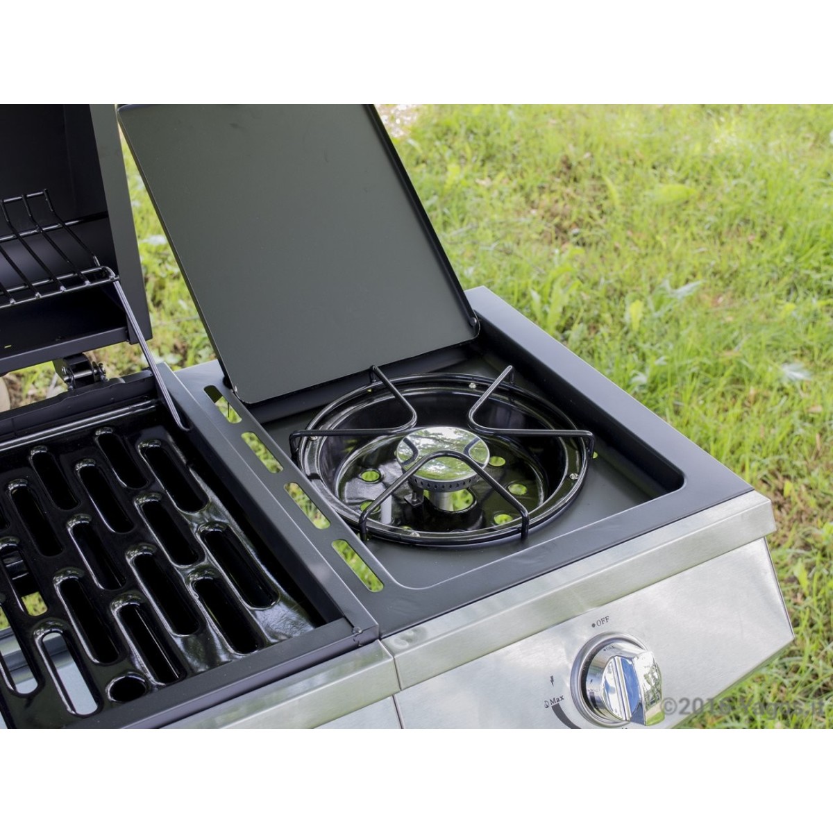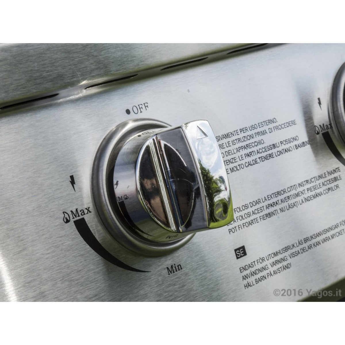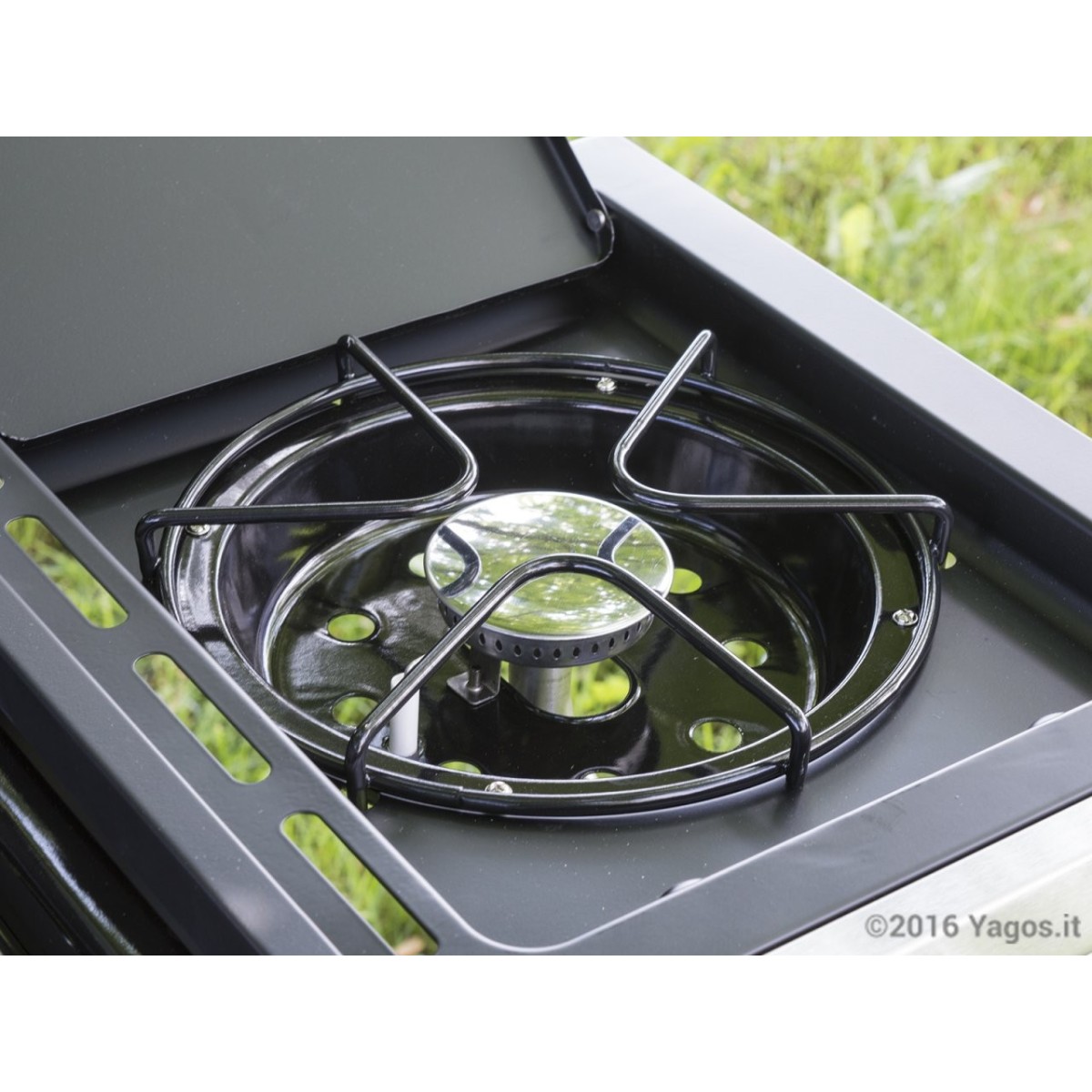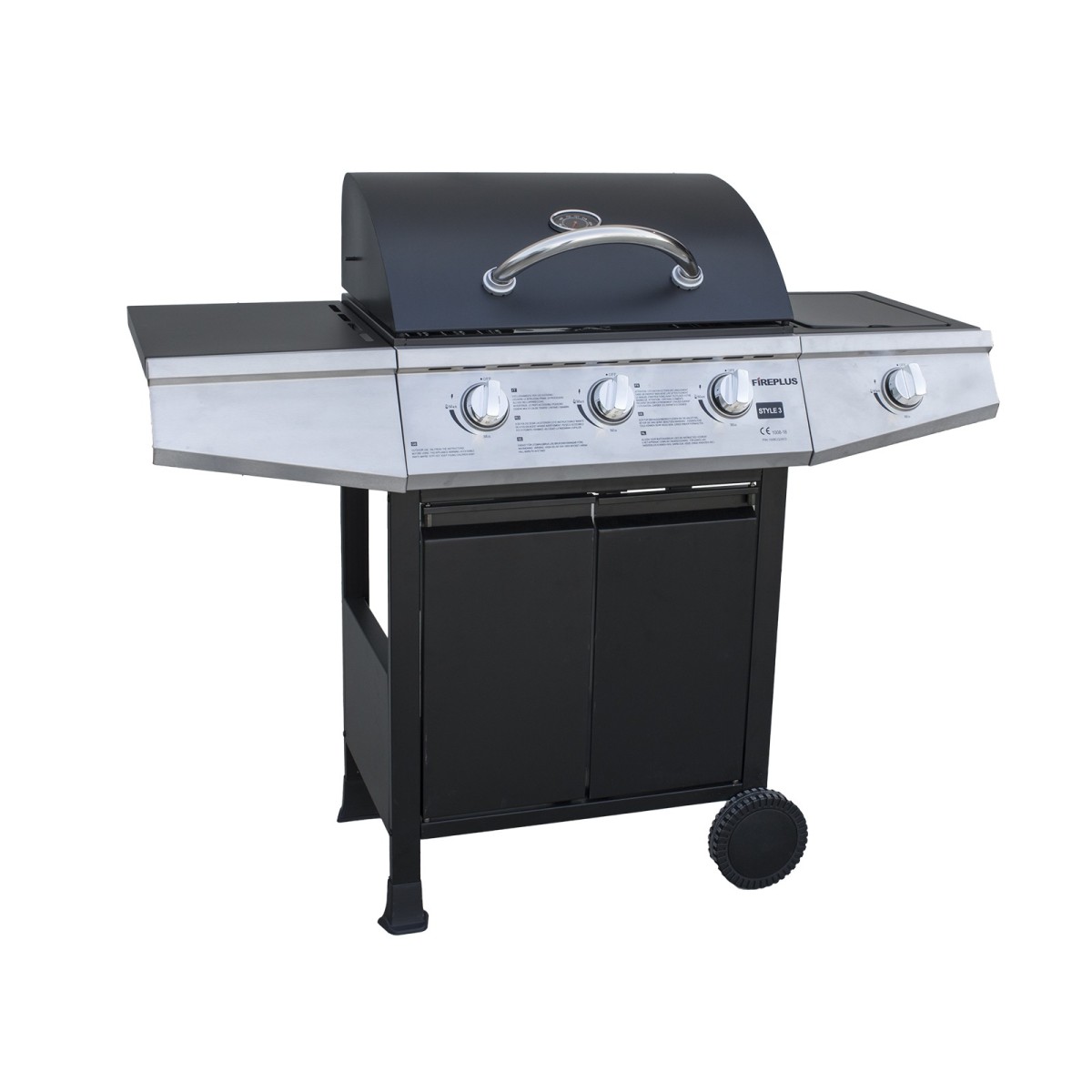 Il barbecue a gas Style 3 Fireplus dotato di 3 bruciatori in acciaio con accensione elettronica e di 1 fornello laterale è un BBQ a gas con 4 fuochi indipendenti che consente di cucinare per tutta la famiglia e gli amici. Style 3 presenta il coperchio smaltato con termometro integrato (0-430 °) con pratico maniglione cromato e due ripiani laterali utili per appoggiare spezie e condimenti, uno dei quali provvisto di fuoco esterno. Grazie alla ampia superficie di cottura da 53x31cm e ai 3 bruciatori si otterrà una cottura omogenea di carne, pesce e verdure, ecc.. E' molto utile il vano sottostante a due ante con maniglie per riporre tutti gli accessori necessari per cucinare, inoltre l'accesso alla bombola del gas è piuttosto comodo. La struttura carrellata con le due ruote permette di spostare il barbecue velocemente e senza fatica.