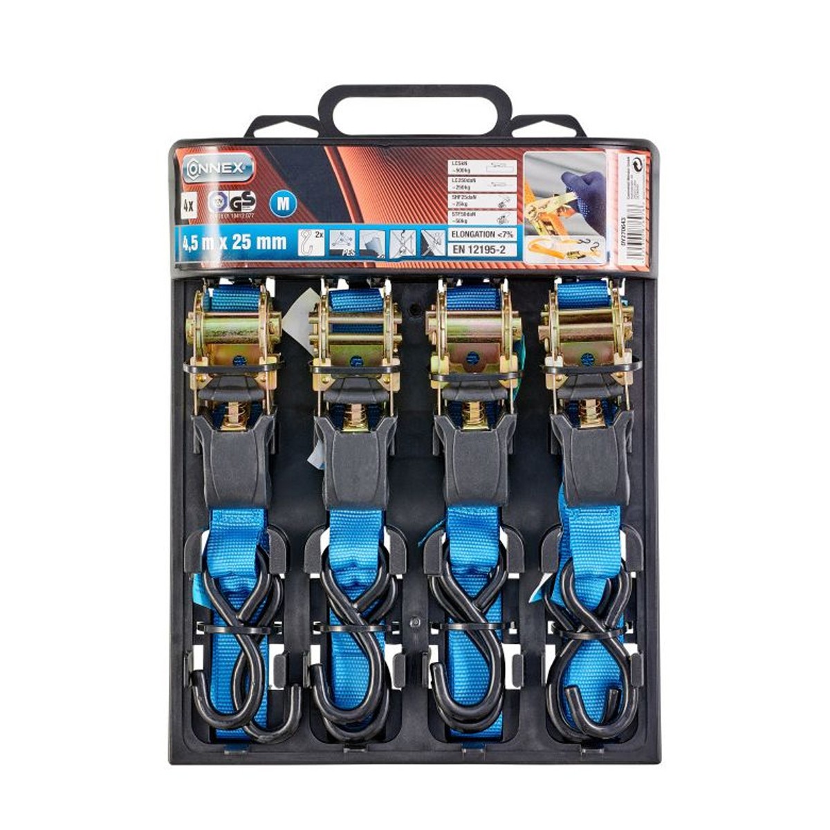 Cinghie di ancoraggio con tenditore e gancio a uncino 4 x 500 kg a norma EN 12195-2. Il set di cinghie di tensione fissaggio con cricchetto di Connex DY270643 è proposto in kit da 4 pezzi e può essere utilizzato come cinghie a cricchetto per camion oppure per il fissaggio di bagagli, merce, materiali edili, ecc.