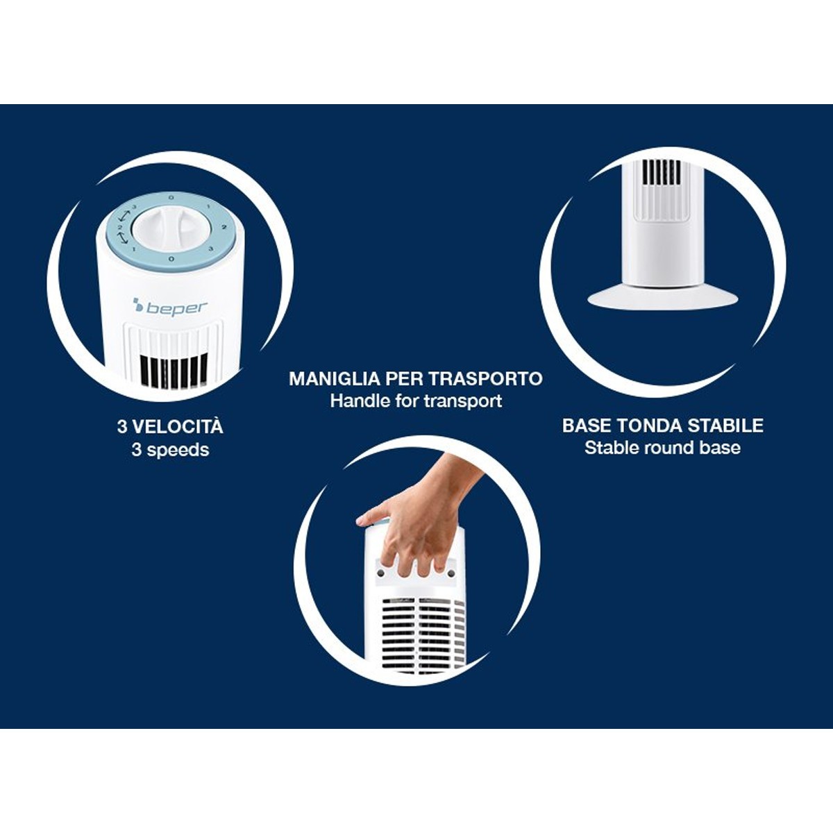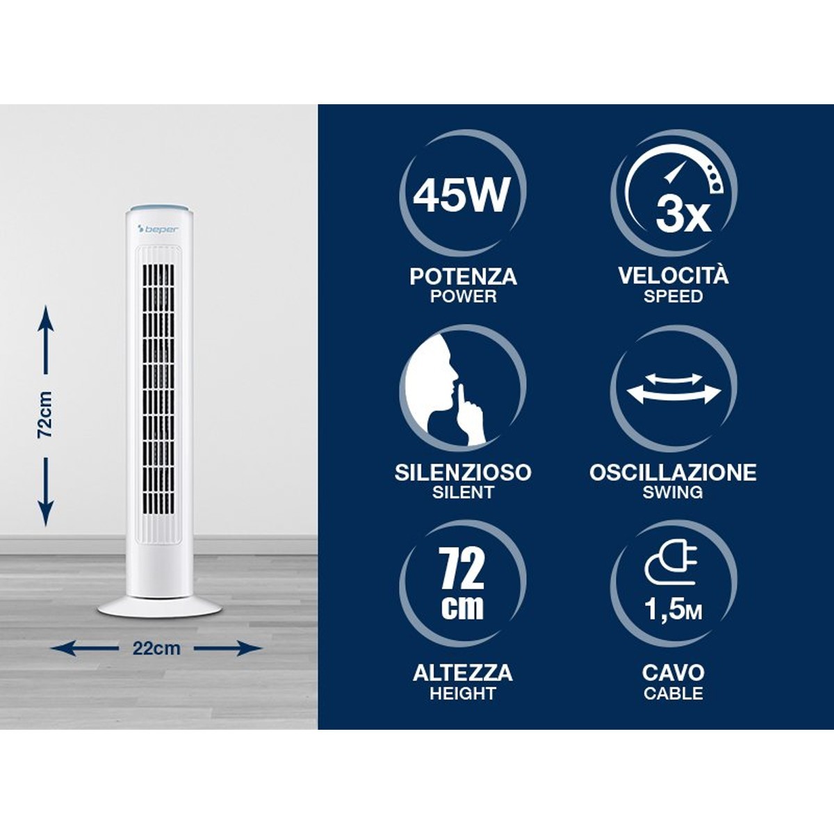 BeperBeper ventilatore a torre con struttura in abs e base stabile. Il ventilatore a colonna Beper smuove l'aria di casa e ufficio occupando poco spazio, inoltre la silenziosità lo rende adatto ad ogni ambiente della casa, anche di notte in camera da letto. Questo ventilatore ha 3 diverse velocità selezionabili e ha la funzione oscillazione orizzontale automatica che garantiscono un raffrescamento omogeneo.