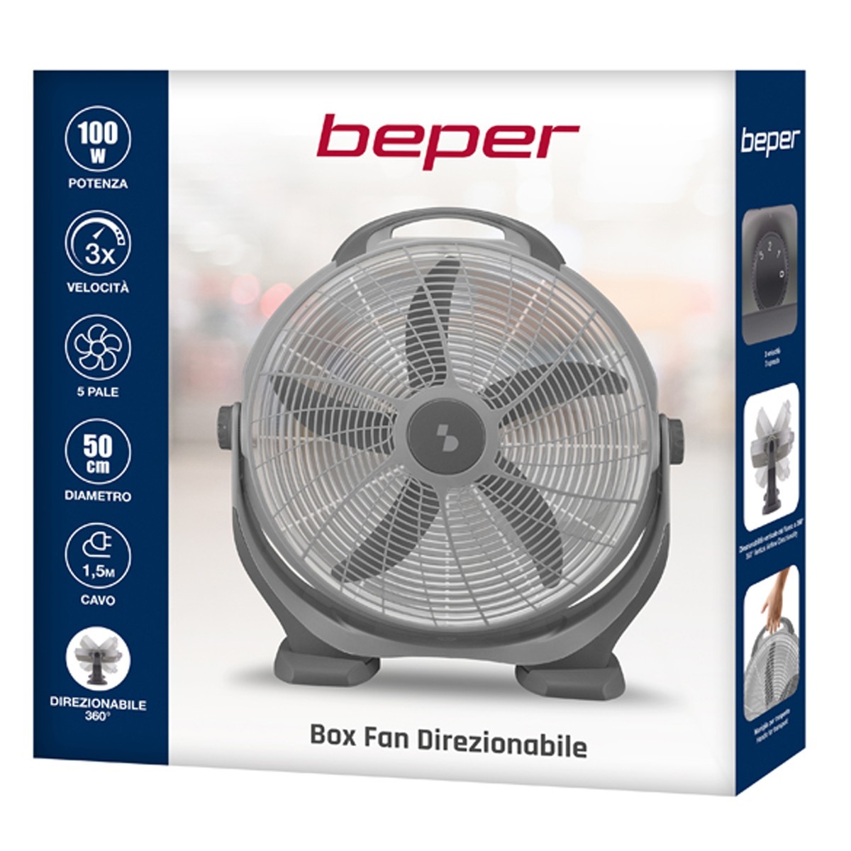 BeperBox Fan Direzionabile ventilatore da pavimento perfetto per ambienti interni ed esterni, in ogni stanza della casa ma anche in terrazza, veranda o giardini e dovunque ci sia bisogno di portare un potente soffio d'aria fresca. Ventilatore da terra stabile e potente grazie alle 5 gradi pale e alla potenza di 100W, inoltre la direzionalità fino a 360° del flusso d’aria permette un'elevata ed uniforme circolazione dell'aria. Il Box Fan di Beper ti consente di scegliere 3 velocità da scegliere in base alle esigenze, per avere il massimo comfort.