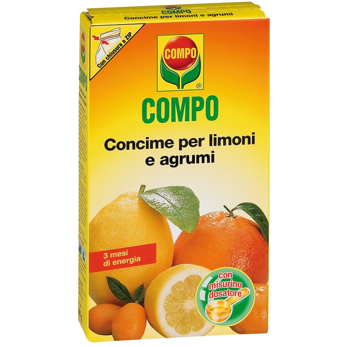 CompoCOMPO concime per limoni e agrumi granulare con sistema CROTODUR® che contiene un alto livello di Potassio, Azoto e Magnesio per permettere uno sviluppo equilibrato di foglie e frutti.