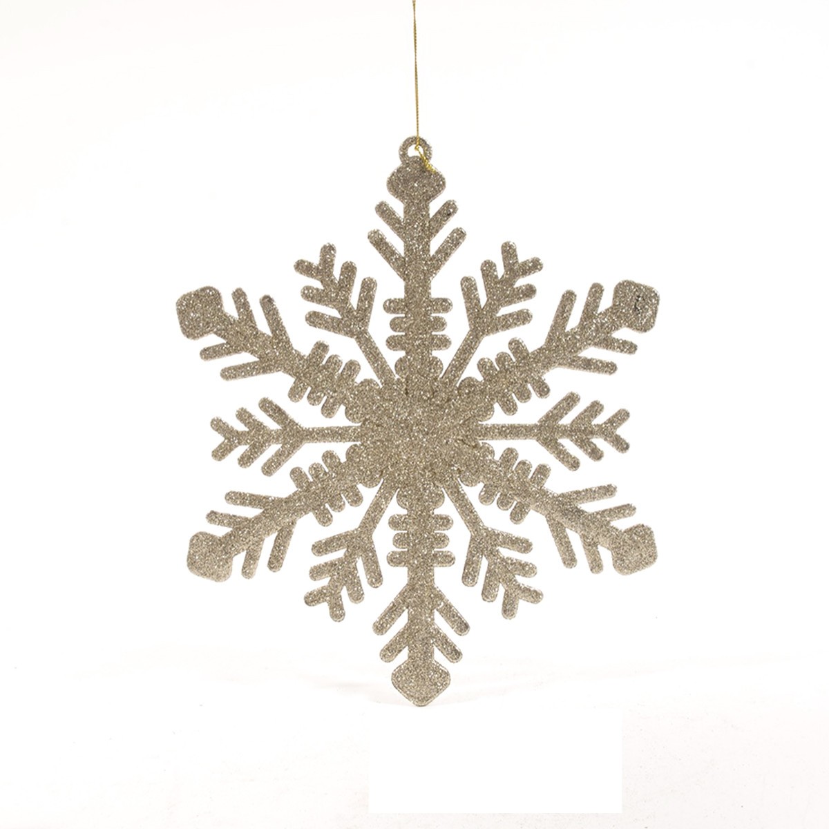 Pendente fiocco di neve dorato con glitter per addobbare con eleganza la tua casa durante il periodo delle feste.