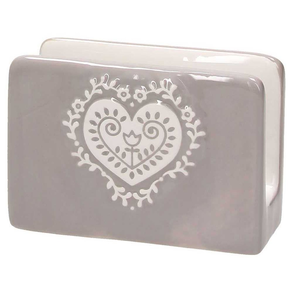 Il portatovaglioli della linea Montana fa parte di un kit di accessori e complementi per la cucina in stile shabby chic. Elemento utile nella tua cucina e a tavola, questo portatovagioli grigio con decoro bianco con al centro un cuore in stile tirolese, porta l'aria di montagna nella tua cucina.