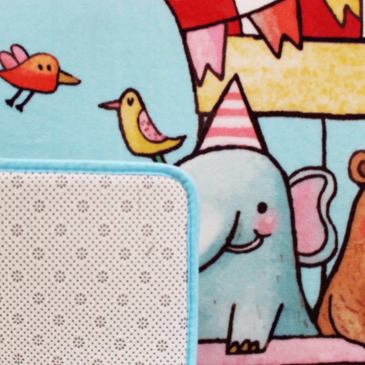 Tappeto bambini Candy azzurro con soggetto mongolfiera. Tappeto per cameretta colorato realizzato in morbida imbottitura di spugna e disegno con stampa digitale in ottima definizione. Tappeto gioco e tappeto arredo per abbellire la cameretta.